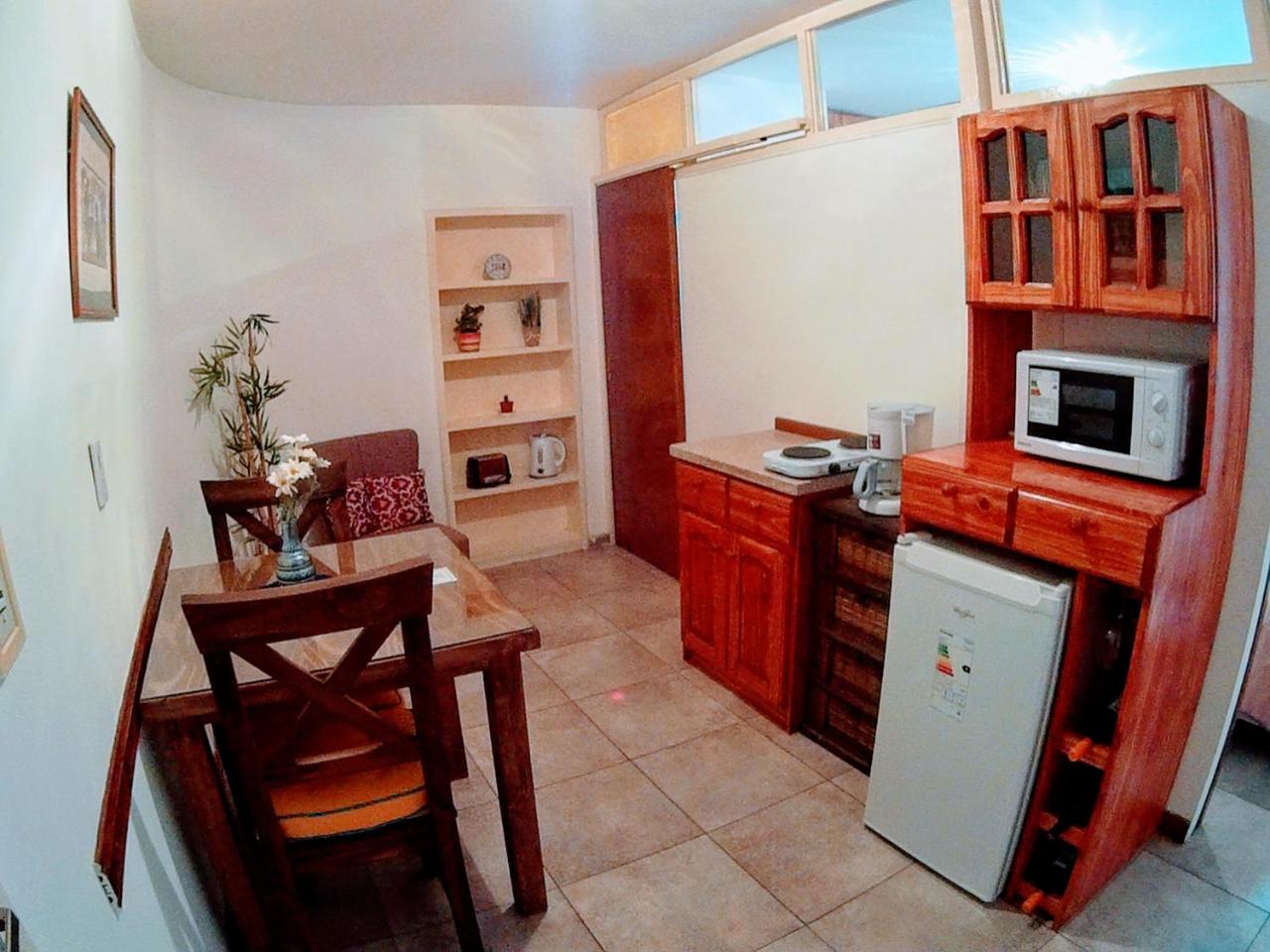 Cocina: Mesa de comedor. Productos de limpieza. Tostadora. Utensilios de cocina. Pava eléctrica. Microondas. Heladera. Kitchenette