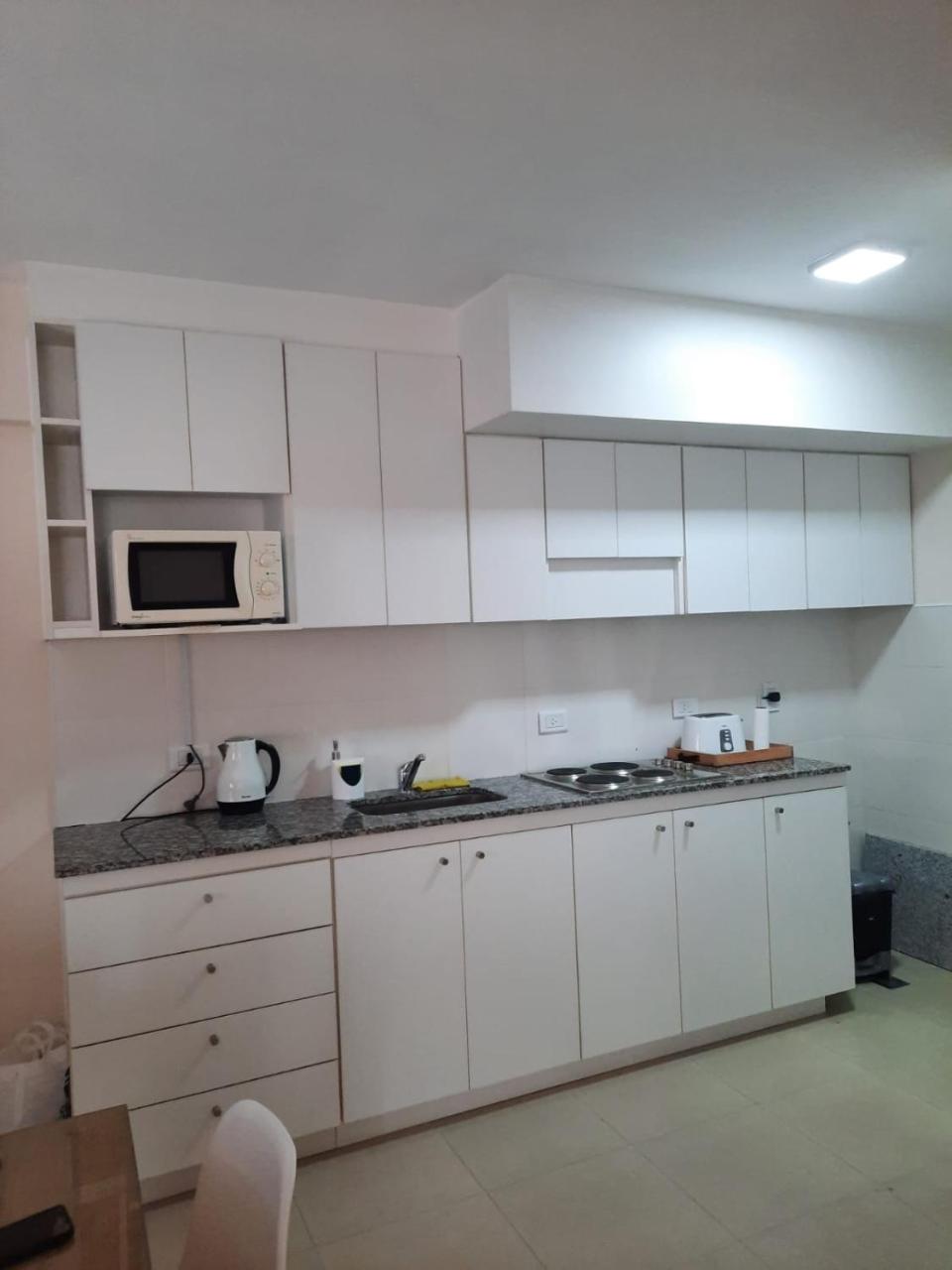 Cocina: Productos de limpieza. Tostadora. Utensilios de cocina. Pava eléctrica. Cocina. Microondas. Heladera. Kitchenette