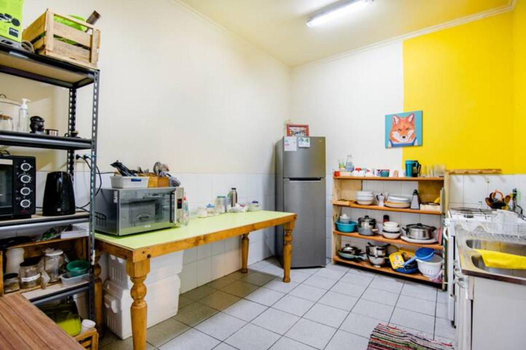 Cocina: Mesa de comedor. Utensilios de cocina. Nevera